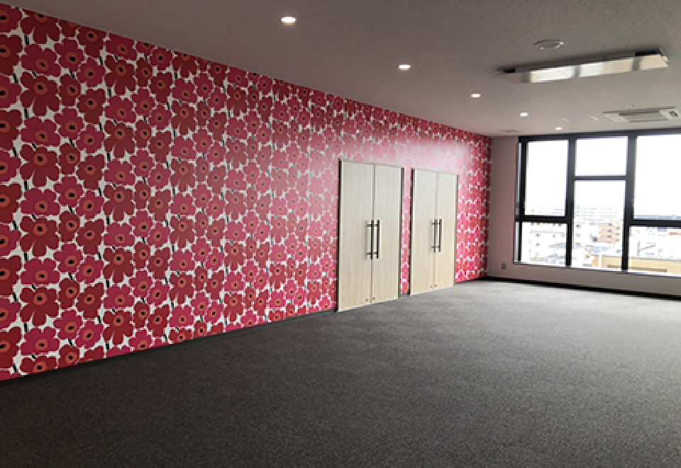 5階ホワイエはマリメッコ社製の壁紙を一面に使用