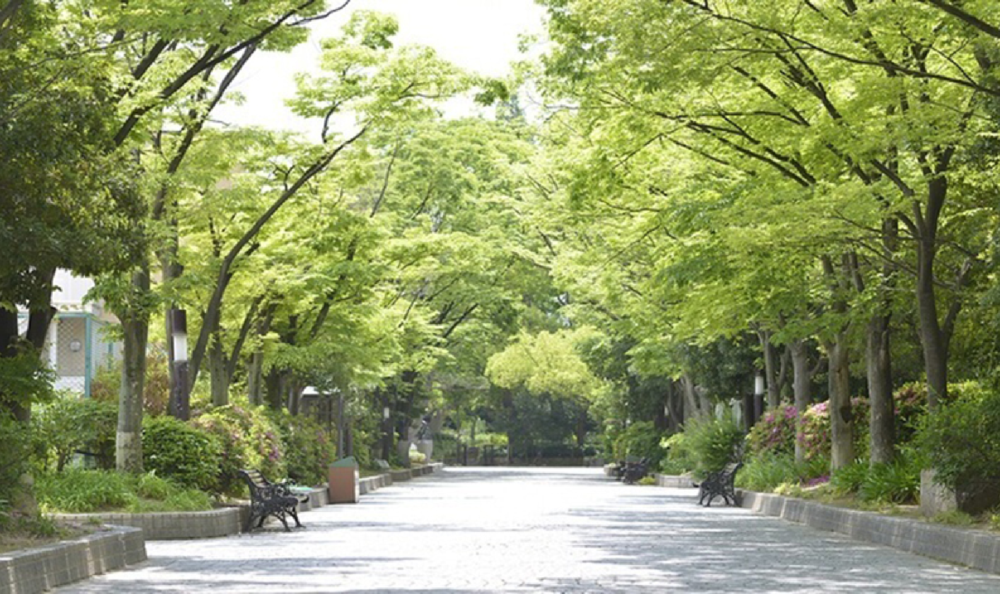 正門から学舎へつづく、けやき並木と御影石を敷き詰めた大通り。