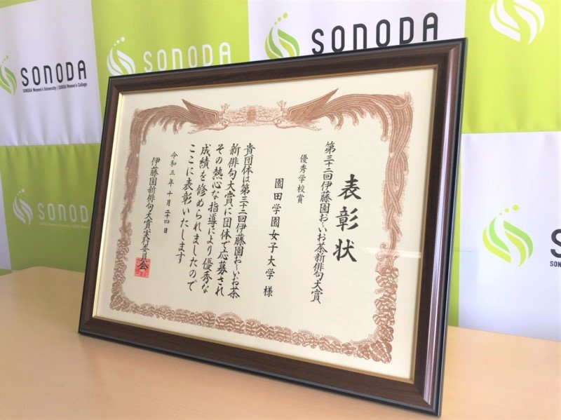 本学の大学、短大全学科で開講されている「日本語表現」の授業の一環で、毎年応募している伊藤園お~いお茶新俳句大賞。本学からの新俳句大賞への団体応募は8度目で、入賞者多数の優秀校に授与される「優秀学校賞」を2年連続でいただきました。