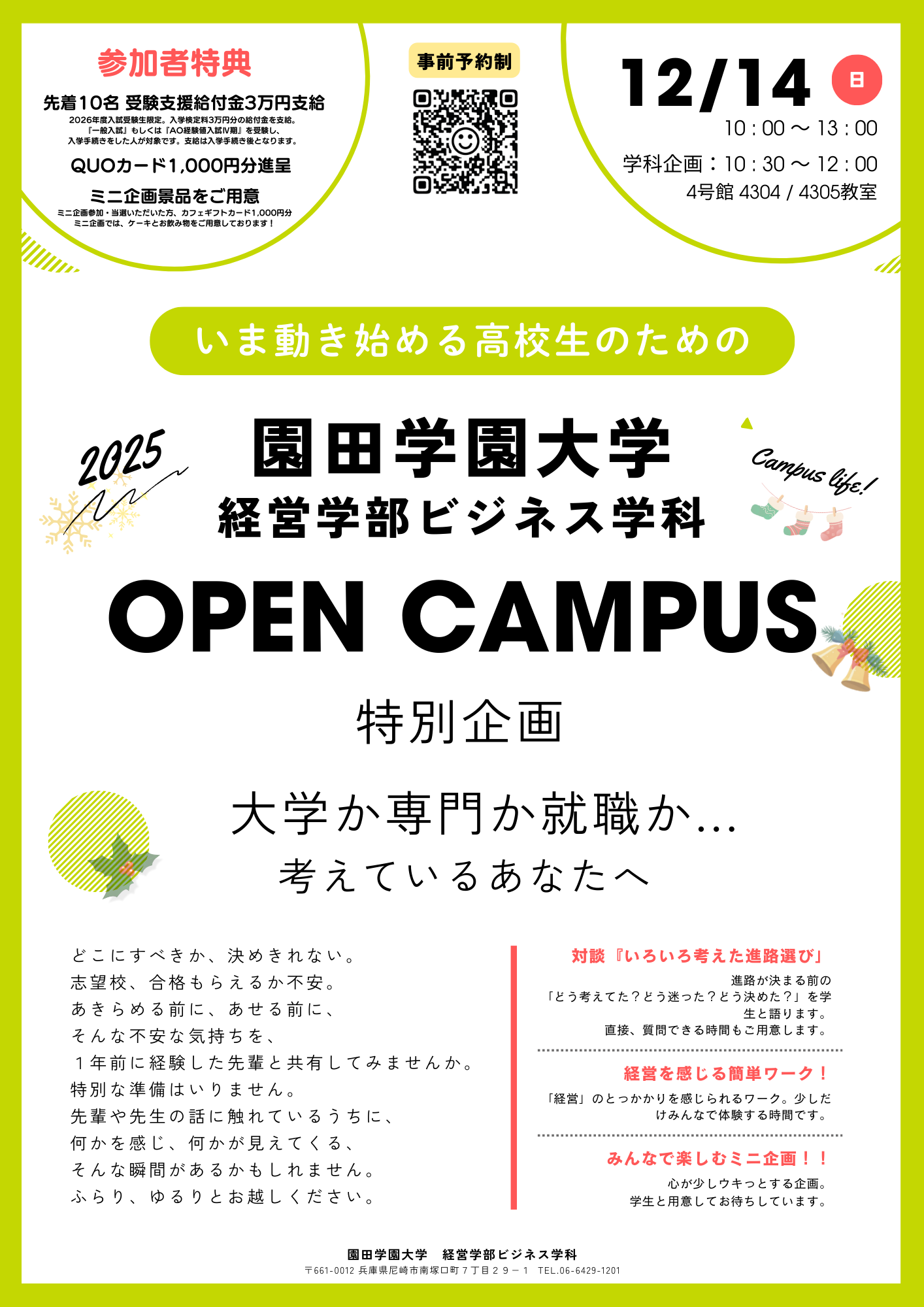 12/14(日)冬のオープンキャンパスで、まだ進路に悩む高校3年生を対象に、ビジネス学科が特別企画を実施します!