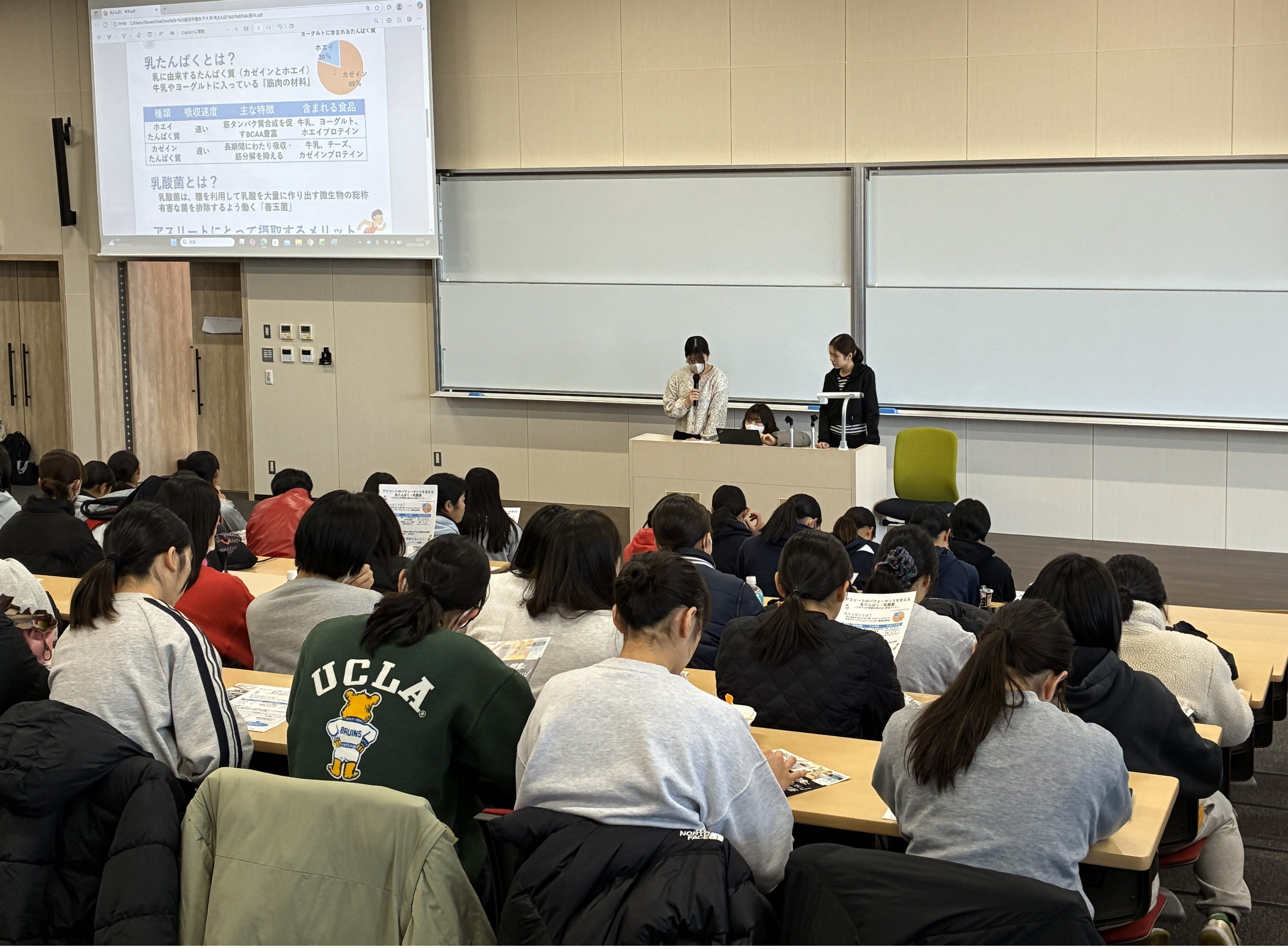 学内のスポーツ強化クラブのアスリート130人に、ヨーグルトの乳たんぱく質と免疫やスポーツとの関係についてオリジナル資料で栄養教育を行いました。