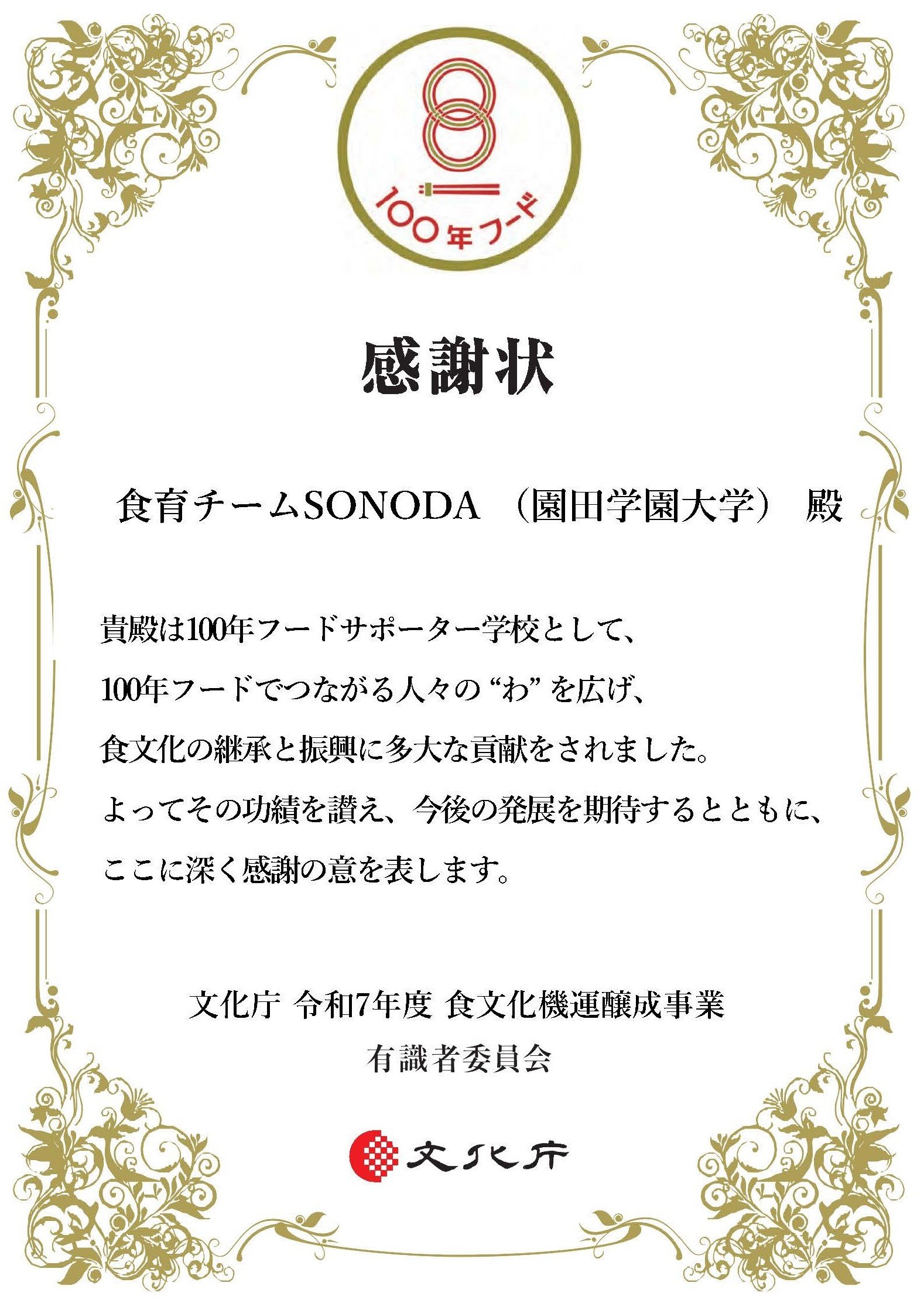 【食マネジメント学科】食育チームSONODAが文化庁100年フードサポーターとして認定され、感謝状が贈られました!